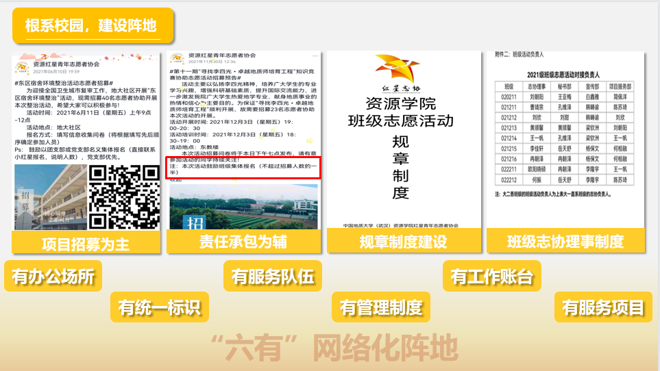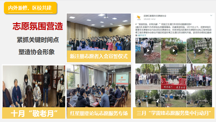 协会在《红星青年志愿者协会章程》指导下,按照有办公场所、有统一标识、有服务队伍、有管理制度、有工作台账、有服务项目“六有”标准搭建活动平台,围绕学校学院事业发展、学习学风及学术科研建设需要、社会社区需求,弘扬志愿服务文化,开展系列志愿公益活动,打造志愿服务项目、品牌,引导青年大学生在实践中受教育长才干,在奉献中实践人生价值。