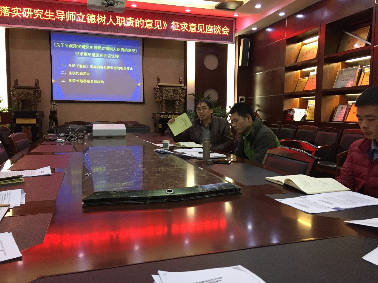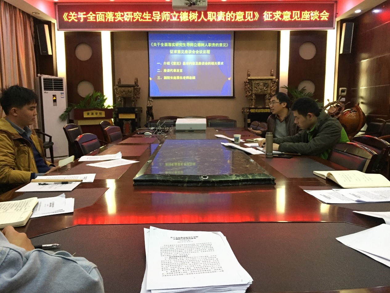 为落实教育部《关于全面落实研究生导师立德树人职责的意见》文件精神,结合研究生院要求,11月29日晚7点,allwincity万象城在主楼330举行《关于全面落实研究生导师立德树人职责的意见》征求意见座谈会。副院长赵葵东、研究生辅导员章帆及来自各个年级近30名研究生代表参加了此次座谈会。会议由研究生辅导员章帆主持,。
