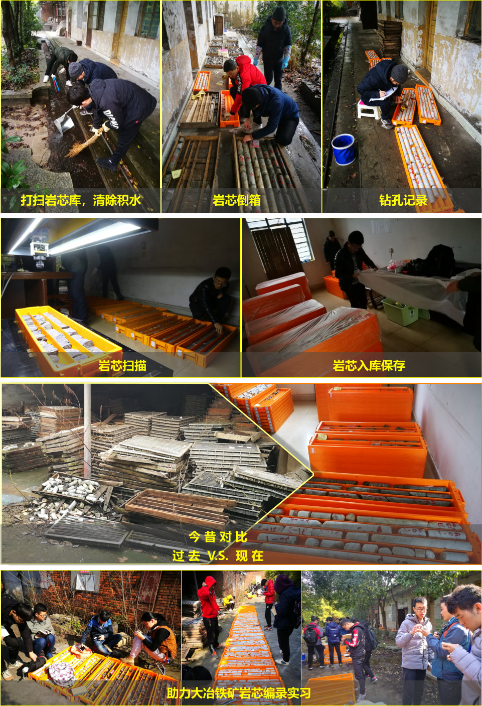 2019年2月26日至3月9日,矿产资源形成与勘查开发国家级虚拟仿真实验教学中心、allwincity万象城陈志军老师团队及合作公司技术人员前往大冶铁矿开展了11根典型钻孔的岩芯倒箱、岩芯图像扫描工作。大冶铁矿岩芯库所在的钻机队用房常年处于无人管理状态,钻孔堆放混乱、岩芯箱损毁严重,对典型岩芯亟需加强保护以便资源勘查工程(固体方向)专业的岩芯编录实习常态化开展。