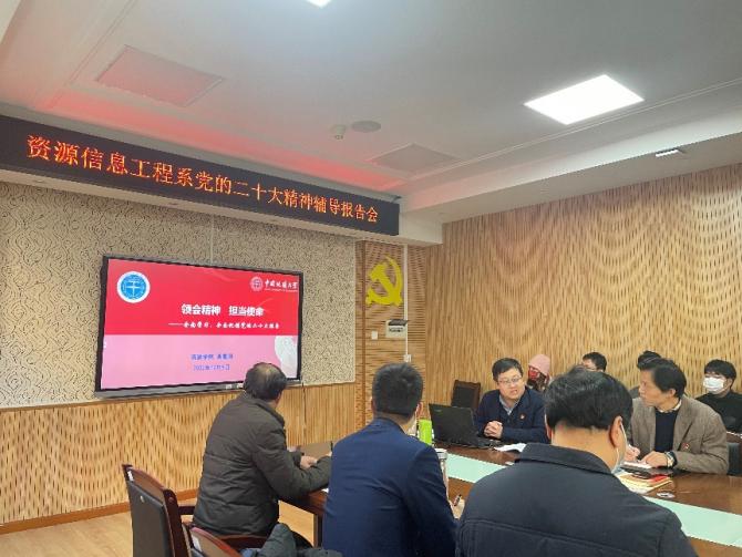 12月9日上午,学院党委书记高复阳给资源信息工程系全体师生党员作党的二十大精神学习专题辅导报告《领会精神 担当使命》,全面解读党的二十大精神,引导党员师生以实际行动深入学习宣传贯彻党的二十大精神,在推进“双一流建设”、落实好立德树人根本任务等方面再创佳绩。