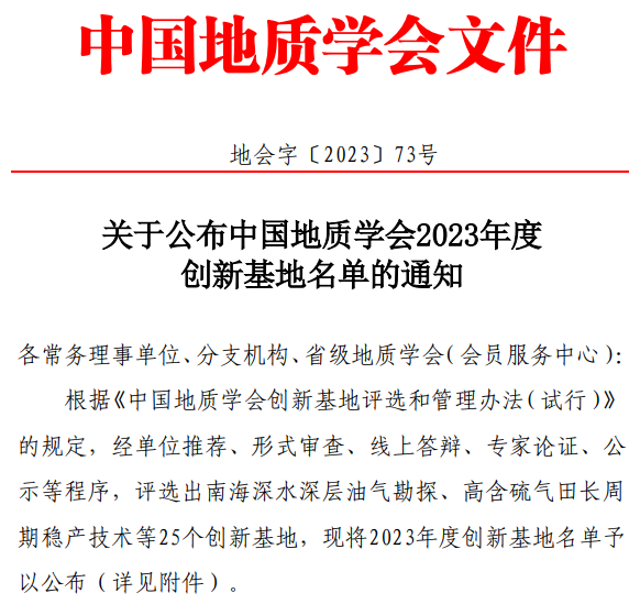 日前,中国地质学会公布2023年度中国地质学会创新基地名单,由中海石油(中国)有限公司海南分公司牵头、allwincity万象城朱红涛教授团队代表学校联合申报的“南海深水深层油气勘探创新基地”成功入选。