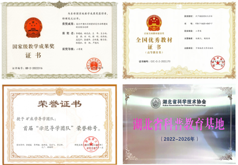 坚持立德树人,教育教学取得重要突破。实行本科生导师制,积极推进以思政引领、科教融合、跨学科交叉融合、国际化培养、专业竞赛等为牵引的人才培养模式,建成了以国家级实验教学示范中心、国家级虚拟仿真实验教学中心、国家一流专业、国家一流课程、国家级规划教材、国家精品课程、国家级教学团队为标志的人才培养体系;强化研究生导师职责,推进研究生导学团队建设,矿床学导学团队获评学校示范导学团队。近年来,1本教材获教育部“首届全国优秀教材二等奖”、1门课程虚拟教研室获批“教育部资源勘查课程虚拟教研室”,1门课程获批湖北省一流课程,1个实验教学中心获批湖北省科普教育基地。1个教学团队获批湖北省高校省级教学团队。1项成果获得国家级教学成果二等奖、湖北省高等学校教学成果特等奖和学校教学成果特等奖。