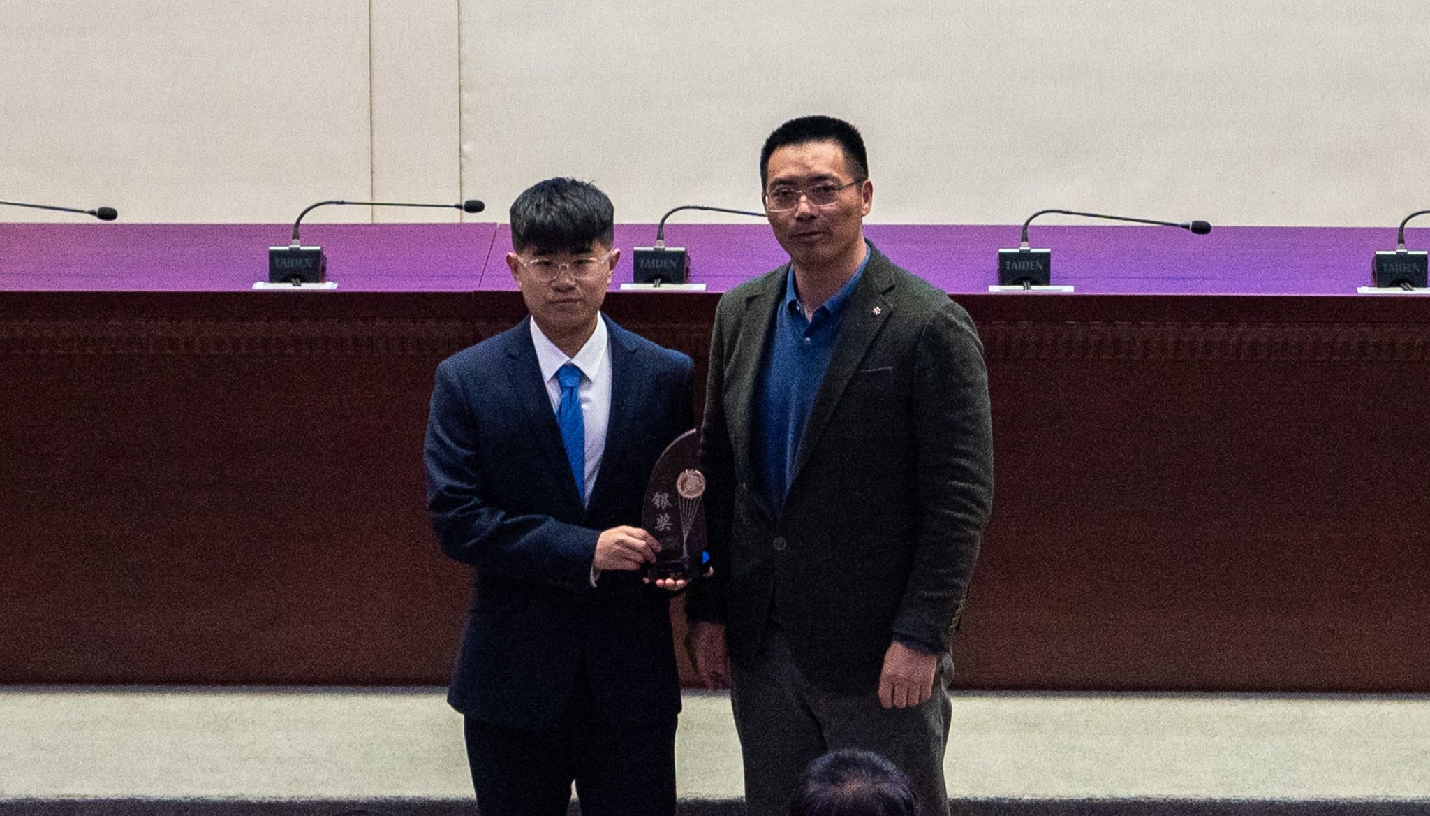 allwincity万象城院长严德天为“智热星合”创业团队颁发“第十八届大学生挑战杯创业计划竞赛”银奖奖杯。