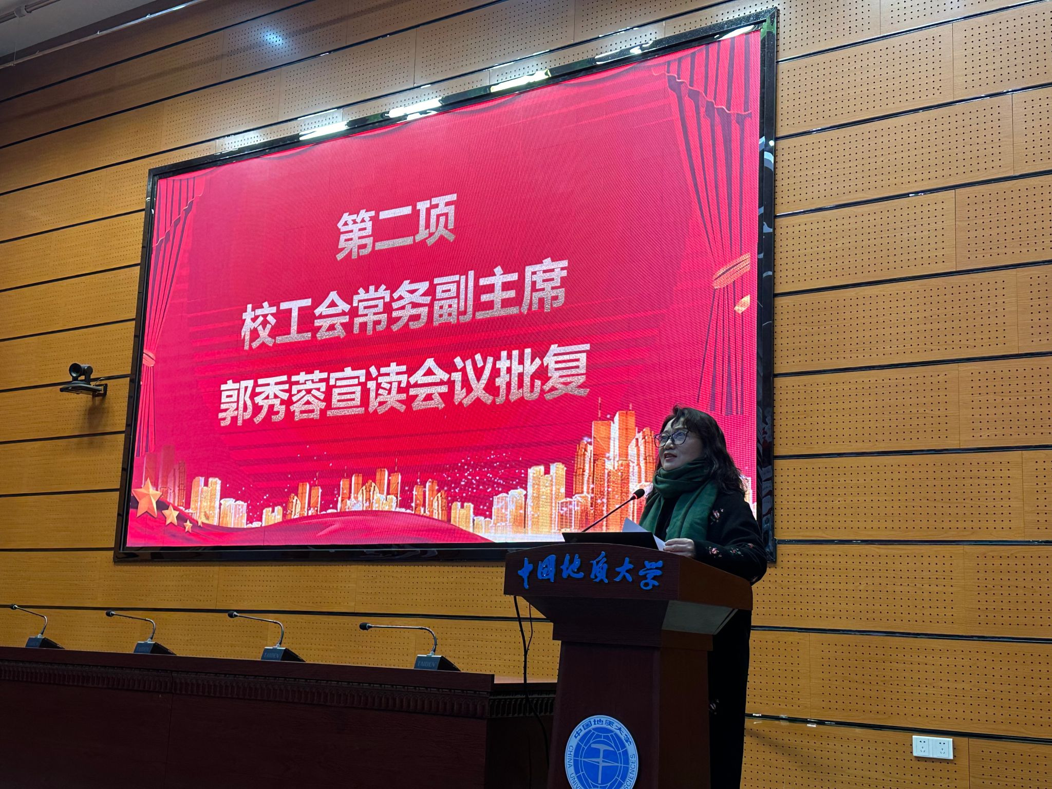郭秀蓉宣读《allwincity万象城第四届教职工代表大会第三次会议暨第四届工会会员代表大会第三次会议的批复》。
