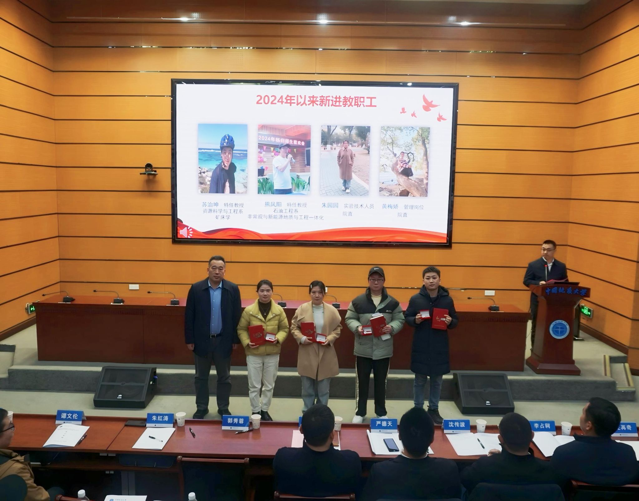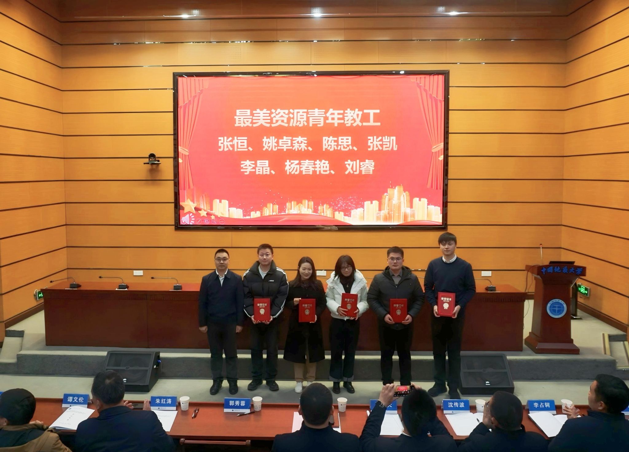 汪再奇为2024年度“最美资源青年教工”获得者张恒、陈思、张凯、李晶、刘睿颁奖。