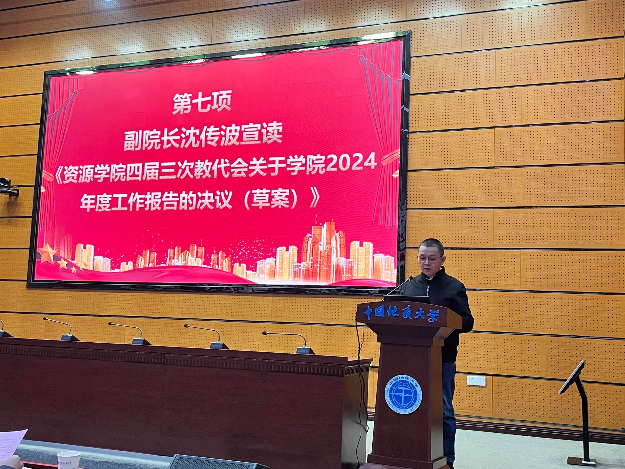 院长严德天作学院2024年度工作报告。他从党建与思政工作、学科与学位点建设、师资队伍建设、教育教学与人才培养、科学研究与社会服务、国际交流与平台建设等6个方面全面阐述了2024年工作情况。他指出,一年来,学院深入学习贯彻党的二十大、二十届三中全会和全国教育大会精神,认真贯彻落实学校第十三次党代会、学院第五次党员大会的决策部署,坚持“四个面向”,紧抓“双一流”建设和“新一轮找矿突破战略行动”等重大机遇,在人才培养、师资队伍、科学研究、社会服务和国际交流等方面取得了一系列重要进展。同时,严德天向大会报告了学院2024年度财务情况。