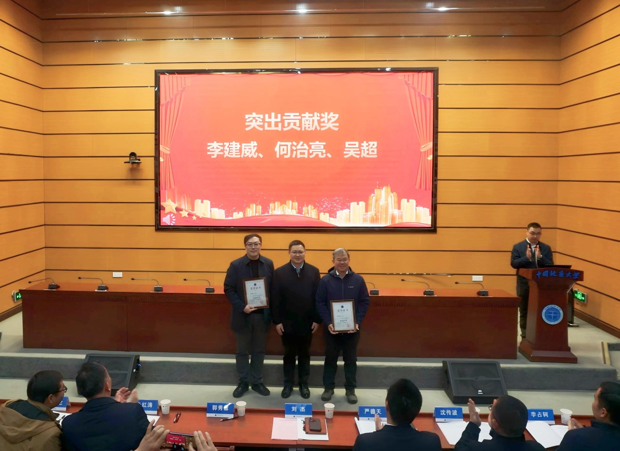 刘杰为学院“突出贡献奖”获得者何治亮、吴超颁奖。