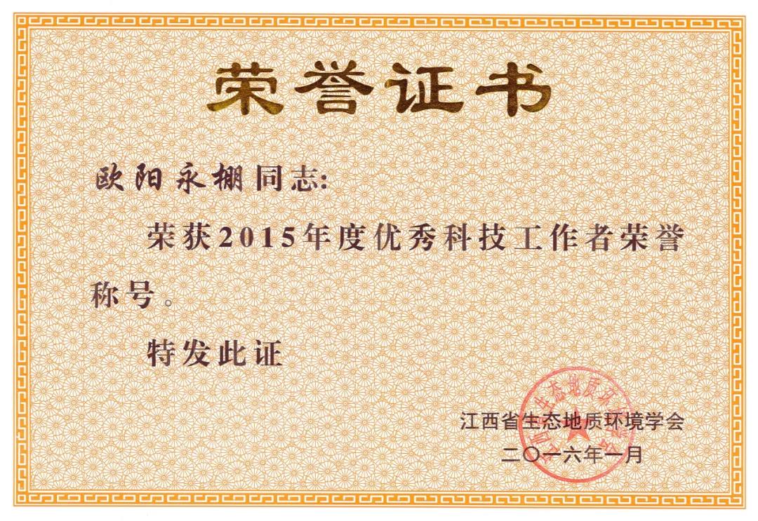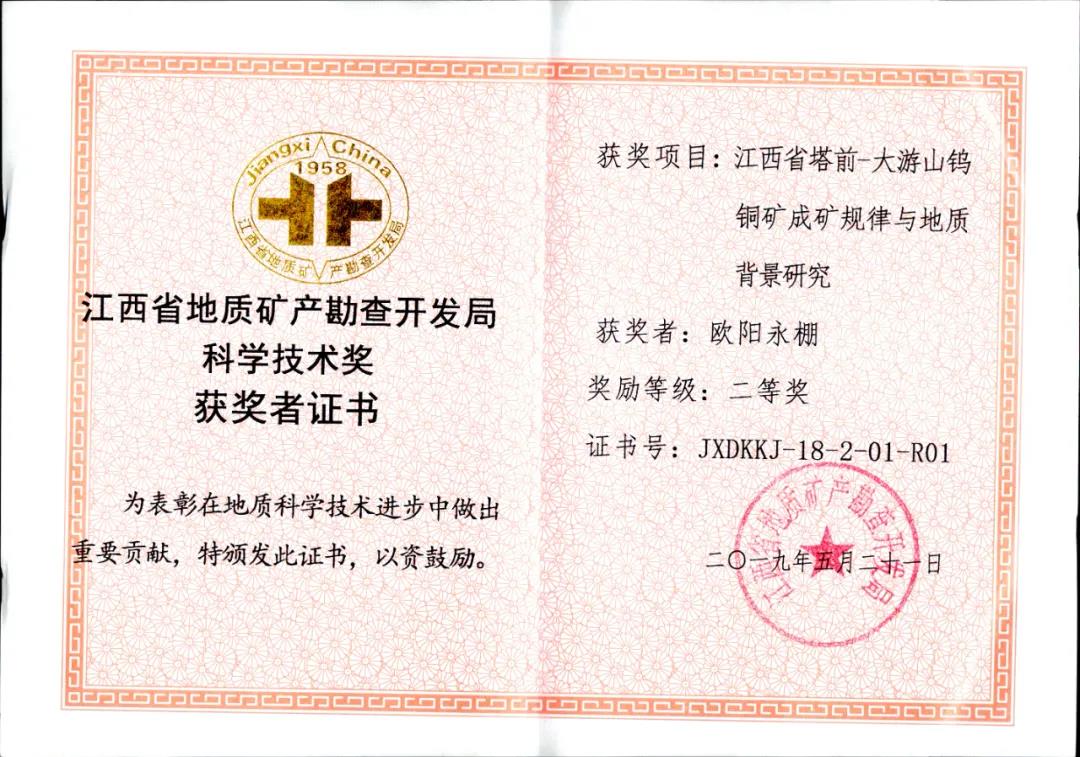 在项目参与的基础上,欧阳永棚时刻学习专业知识、关注科研动态,与各大科研高校团队保持密切联系,并还不忘将研究成果总结整理成科技论文发表于诸家刊物。以第一/通讯作者发表SCI3篇、EI 1篇、中文核心8篇;参与编写《朱溪超大型钨铜矿床构造与成矿》、《华南洋-滨太平洋构造演化与成矿作用》等专著。先后10次参加国内外地质专业会议,并做口头报告8次,亦获得过1次优秀口头报告奖。撰写的论文《朱溪式与岩浆活动有关的矽卡岩型矿床“特征”》从20多位参赛选手中脱颖而出,被评为江西省生态地质环境学会2016年科技论坛学术论文交流一等奖。