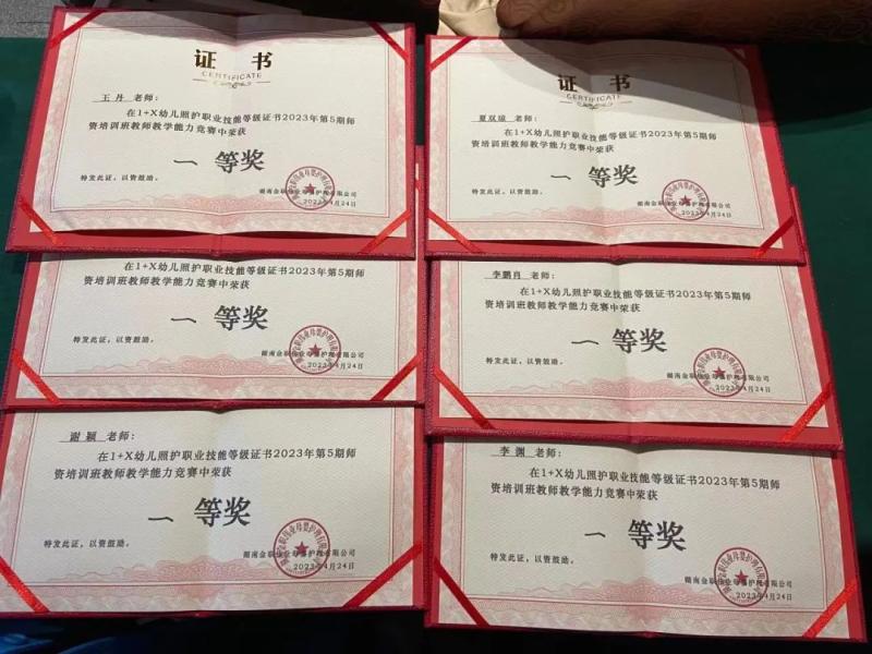 为全面落实国家教育部等四部门《关于在职业院校实施“学历证书+若干职业技能等级证书”制度试点方案》的通知精神,全国职业院校1+X幼儿照护职业技能等级证书2023年第5期师资培训班教师教学能力竞赛在湖南长沙顺利举行。来自全国20所职业院校参加了教师教学能力竞赛。bat365中文官方网站选派的李渊、李波、王丹、李鹏肖、夏双琼、谢颖等6名教师,经过激烈紧张的角逐,荣获教师教学能力竞赛一等奖。