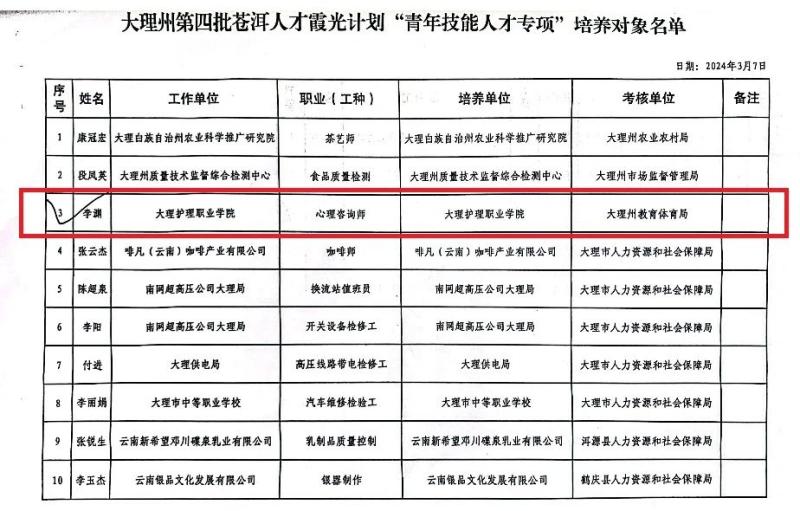 根据《中共大理州委办公室 大理州人民政府办公室关于实施苍洱人才“霞光计划”推动新时代大理高质量可持续发展的意见》、《大理州“苍洱霞光”人才评审认定暂行办法》和《苍洱人才霞光计划“青年技能人才培养专项”实施细则》的要求,经个人申报、单位推荐、专家评审等程序,bat365李渊老师入选2024年度大理州第四批苍洱人才霞光计划“青年技能人才专项”培养对象。