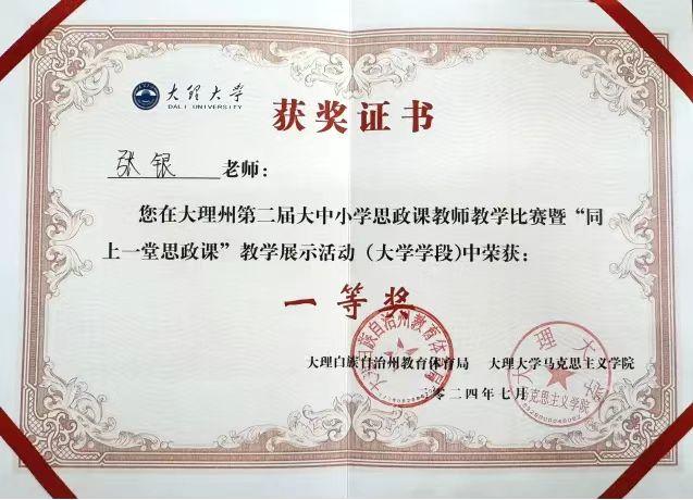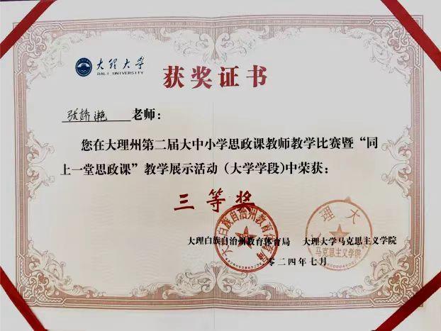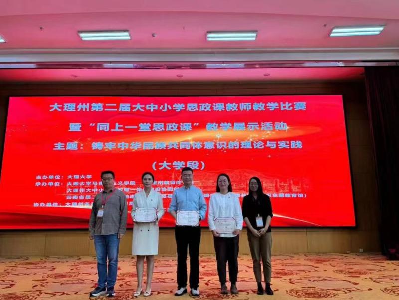 7月14日,由大理州教育体育局、大理州大中小学思政课一体化建设协同创新中心承办,大理大学主办的大理州第二届大中小学思政课教师教学比赛暨“同上一堂思政课”教学展示成功举办并圆满结束。bat365中文官方网站马克思主义学院选派两名思政课教师参赛获优异成绩。在大理州大学段竞赛中张银老师获一等奖,张娇滟老师获三等奖。