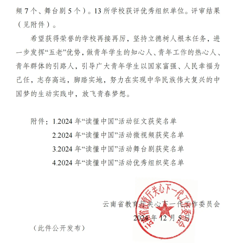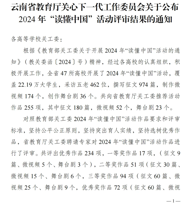 云南省教育厅关工委2024年“读懂中国”活动征文获奖名单