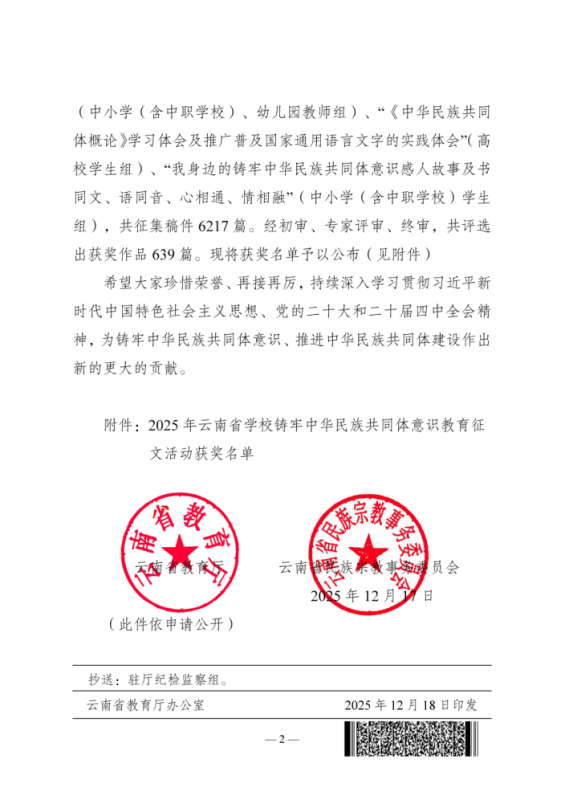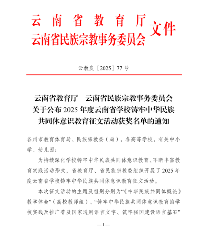 喜讯||bat365中文官方网站教师荣获2025年云南省铸牢中华民族共同体意识教育征文二等奖​