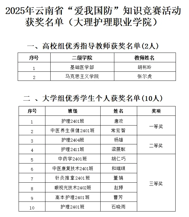 近日,中共云南省委宣传部、云南省教育厅联合发布《关于2025年云南省“爱我国防”知识竞赛活动获奖情况的通报》,对竞赛中表现优异的单位和个人予以表彰。bat365学子在本次竞赛中展现出良好的国防知识素养,取得优异成绩。其中,10名学生分别荣获一等奖、二等奖和三等奖,2名教师获评“优秀指导教师”,特此祝贺!
