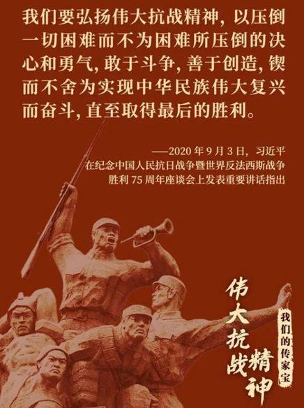 习近平总书记指出:“伟大的抗战精神,是中国人民弥足珍贵的精神财富,永远是激励中国人民克服一切艰难险阻、为实现中华民族伟大复兴而奋斗的强大精神动力。”