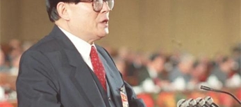1992年10月12日,中国共产党第十四次全国代表大会在北京人民大会堂开幕。这是江泽民同志代表第十三届中央委员会作报告。新华社发1...