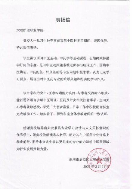 表扬信充分肯定孙春雨在见习期间的优异表现:虚心好学、刻苦钻研,展现出扎实的专业素养;善于与患者沟通,耐心细致、亲和力强,深受患者喜爱;工作中踏实肯干,积极配合科室任务,得到全体带教老师的一致认可。