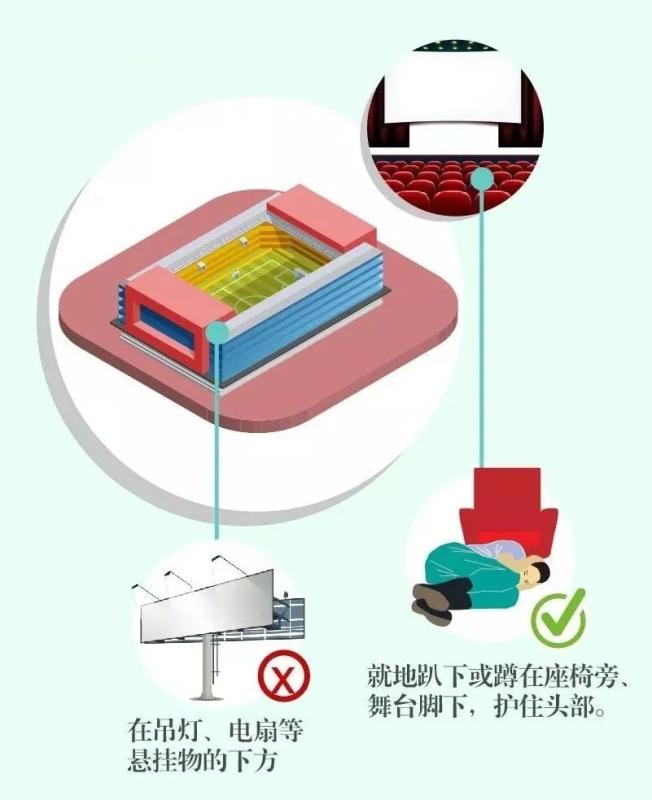 在公共场所如何避震:在公共场所遭遇突发事件,无论是躲避还是疏散撤离时,都务必听从现场工作人员的指挥。
