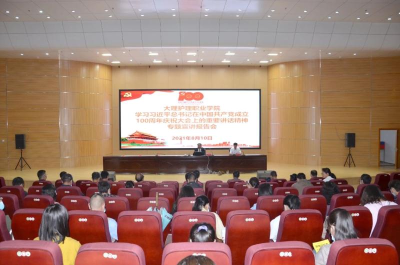 8月10日,根据大理州委党史学习教育领导小组部署安排,bat365中文官方网站举行学习贯彻习近平总书记在庆祝中国共产党成立100周年大会上的重要讲话精神专题宣讲报告会。报告会由州委宣讲团成员,州委党校副教授、文史教研室主任杨宗老师以“新时代的政治宣言和行动指南”为主题进行专题宣讲。学院党委领导班子成员、党员、干部和教职工139人参加宣讲报告会,会议由学院党委书记王荣富主持。