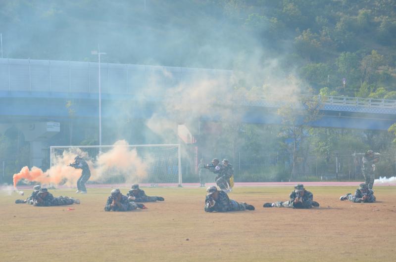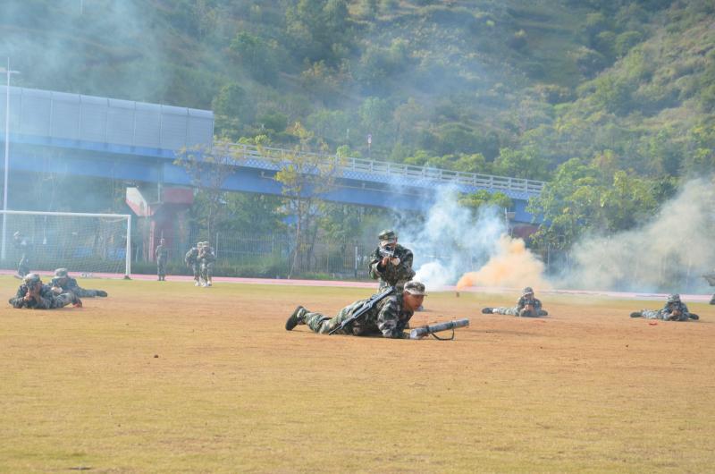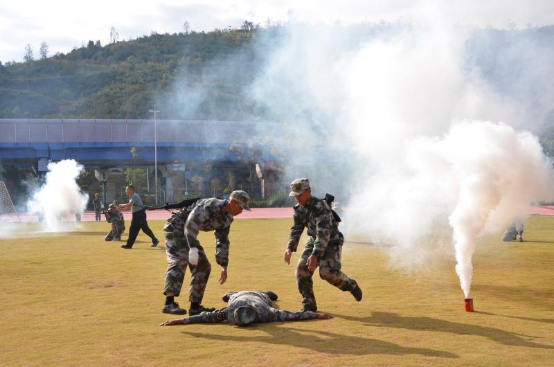 由100余名参训学生组成的战场救护队,一身戎装,穿行在硝烟弥漫的战火中,救死扶伤,大爱无疆,彰显了新时代青年学子保家卫国的凌云壮志。