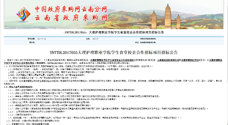 bat365中文官方网站学生食堂校企合作招标项目(YNTTDL2017055)招标公告于2017年7月21日在中国政府采购网、云南省政府采购网发布招标公告。