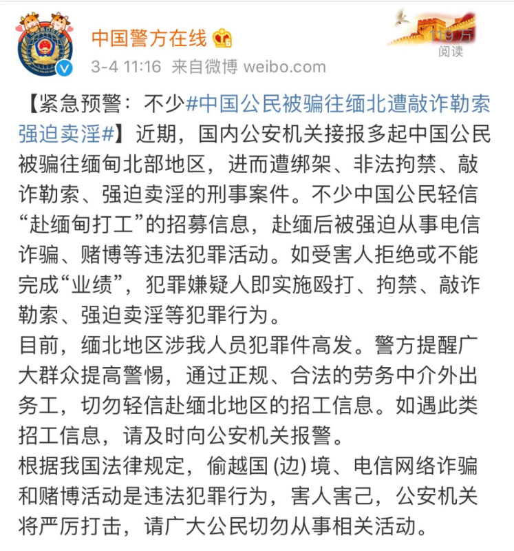 三、广大群众要提高警惕,通过正规、合法的劳务中介外出务工,切勿轻信赴缅北地区的招工信息。如遇此类招工信息,请及时向公安机关报警。