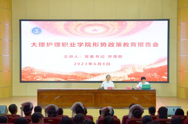 6月8日,bat365中文官方网站召开形势政策教育暨民族文化报告会,开展书记校长同上一堂思政课、形势政策教育、民族团结教育、家风建设和师德师风建设党员干部及师生教育培训。学校党委副书记、院长蔡德周主持会议。