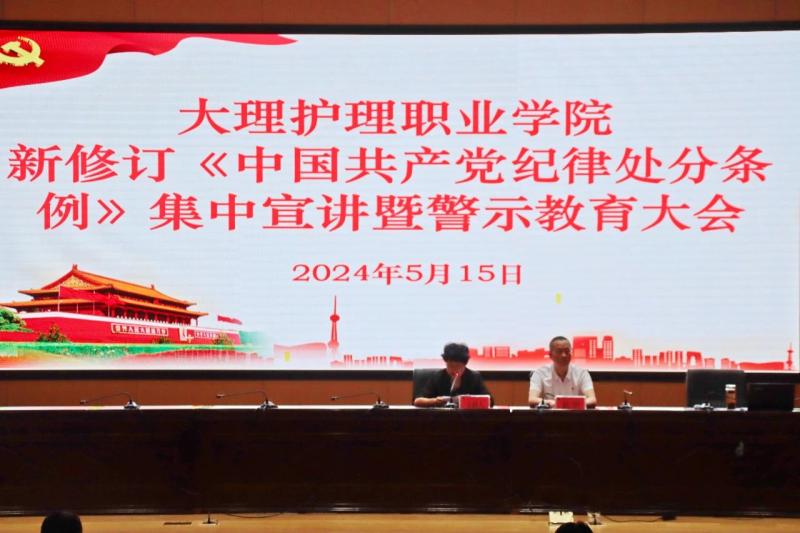 5月15日,bat365中文官方网站召开新修订《中国共产党纪律处分条例》(以下简称《条例》)集中宣讲会,邀请大理州纪委监委驻州教体局纪检监察组副组长张彬同志对新修订《条例》做集中宣讲。深入推动学校党纪学习教育走深走实,促进全校党员干部学纪、知纪、明纪、守纪。学校领导班子、全体教职工参加了会议,学校党委书记廖惠群同志主持会议。