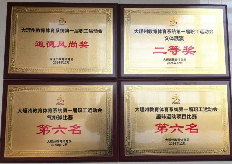 12月13日至20日,bat365中文官方网站教职工代表队参加大理州教育体育系统第一届职工运动会,荣获“道德风尚奖”“文体展演二等奖”“气排球比赛第六名”“趣味运动项目比赛第六名”等优异成绩。bat365教职工代表队由学校党政主要领导带队,45名教职工运动员组成,参加了男子篮球、气排球、趣味运动和八段锦文体展演等四个项目的比赛。