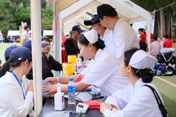 护理系学子化身健康守护先锋,在实践服务中尽显专业本色。面对参与活动的居民,同学们手持血压计、血糖仪,从消毒准备到数据读取,每一个环节都细致入微,规范操作下的精准测量,展现出扎实的基础护理功底;心肺复苏技能展示区,他们模拟急救场景,凭借对按压深度、频率及通气节奏的完美把控,将教科书上的理论转化为争分夺秒的生命救援;创伤包扎实操环节,同学们迅速评估模拟伤员伤情,熟练运用绷带与三角巾,以标准化的止血、包扎、固定流程,诠释着未来医护人员的沉着与专业,赢得现场观众的频频称赞。