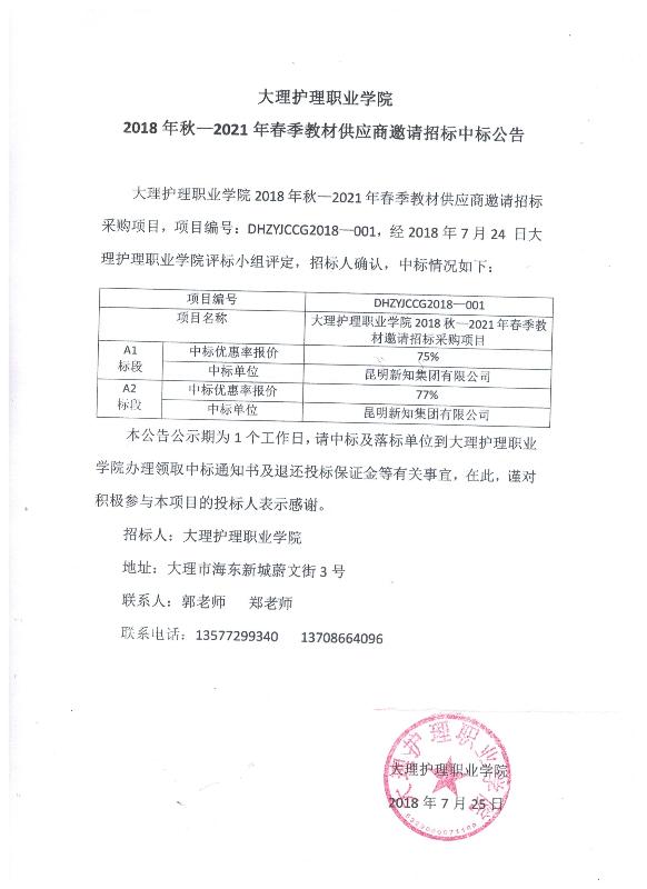 bat365中文官方网站2018年秋—2021年春季教材供应商邀请招标采购项目,项目编号:DHZYJCCG2018—001,经2018年7月24 日bat365中文官方网站评标小组评定,招标人确认,中标情况如下: