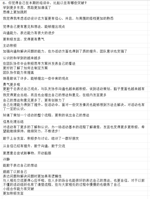 学生骨干们纷纷表示,不仅掌握了更为系统的活动组织筹备知识与技能,更在学习实践中增强了自信心和责任感,同时也学会了在反思中不断提升自我,为今后更好地服务校园、引领同学打下了坚实基础。