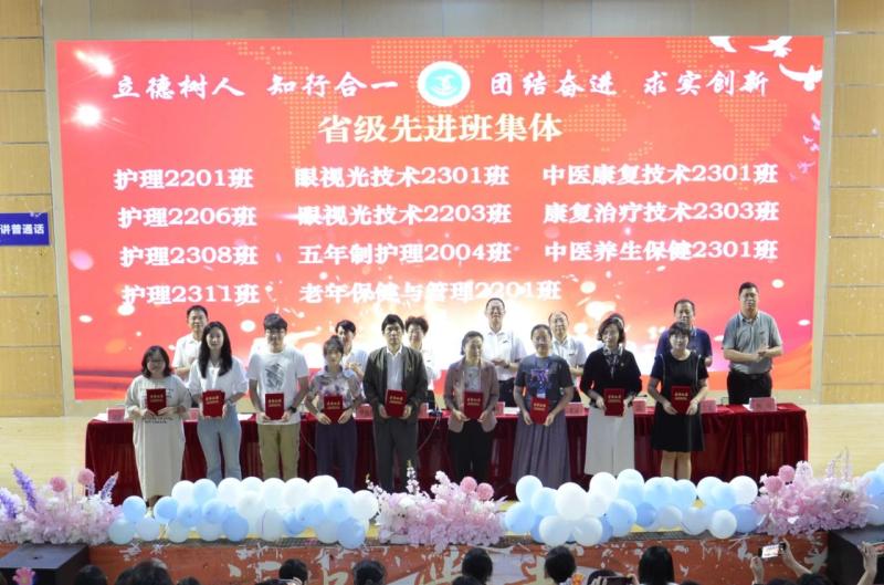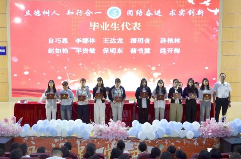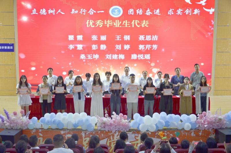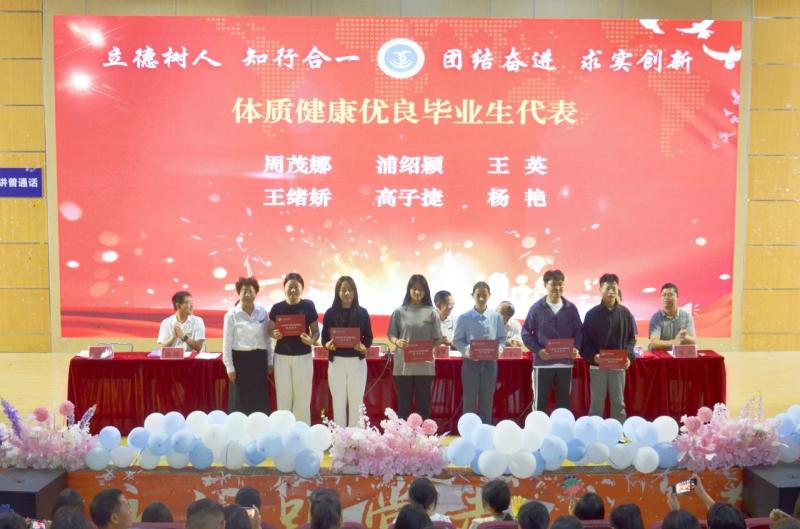 学校领导为毕业生代表颁发毕业证书,为“省级优秀毕业生”代表、“省级先进班集体”班主任和“体质健康优良”毕业生代表颁发荣誉证书。