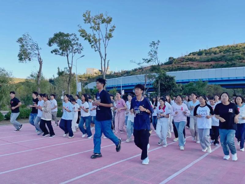 活动首先进行了青春健康知识讲解。专业老师通过生动讲解,普及了疾病预防、生殖健康等内容,提升了师生的健康意识和自我保护能力。在乐跑活动中。师生们佩戴着象征健康与希望的红丝带,迈开矫健的步伐,在足球场上奔跑。红丝带在阳光下随风飘扬,象征着青春的活力与对健康的追求。师生们相互鼓励、相互支持,充分展现了bat365师生积极向上、团结协作的精神风貌。