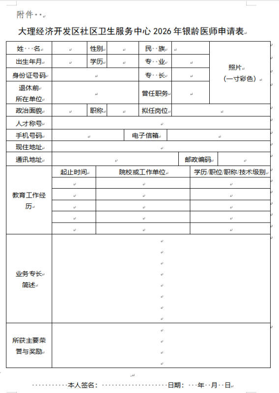 1.《大理经济开发区社区卫生服务中心2026年银龄医师申请表》(需提供电子版及加盖公章的扫描件)。