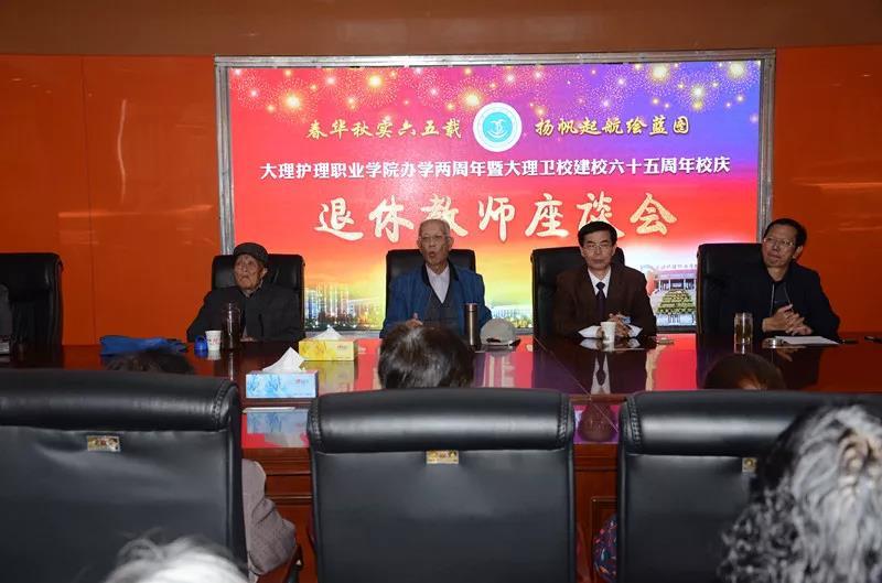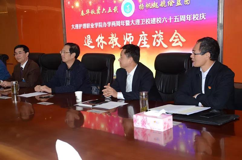 在隆重庆祝bat365中文官方网站办学两周年暨大理卫校建校六十五周年之际,学院召开离退休教师座谈会,紧紧围绕“忆过去、看现在、思未来”这一主题,虚心倾听离退休老教师的意见建议,共谋学院未来发展。学院党委委员、副院长陈跃祥主持座谈会,院领导、科级干部、系(部)党政负责人和离退休老教师参加了会议。