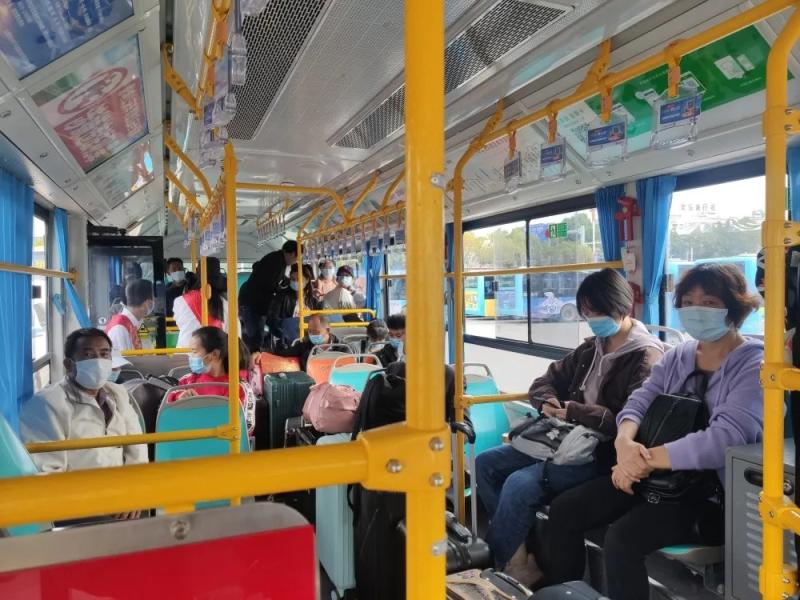 来自各地的新生、新生家长在志愿者的帮助、引导下坐上了前往学院的公交车。