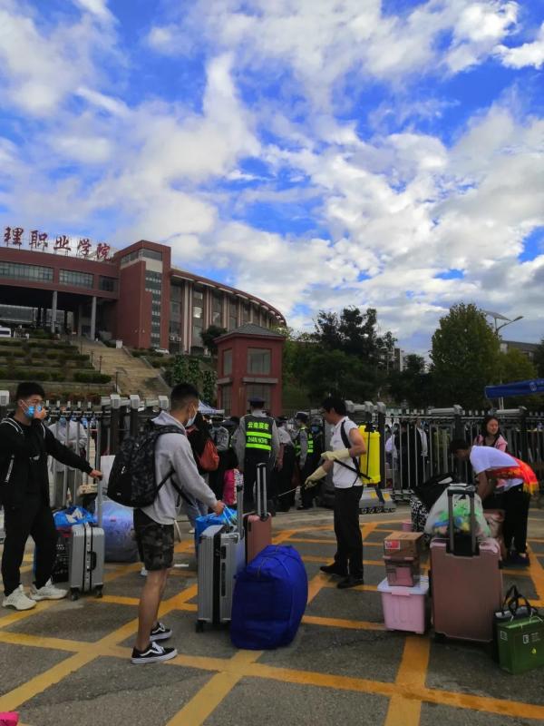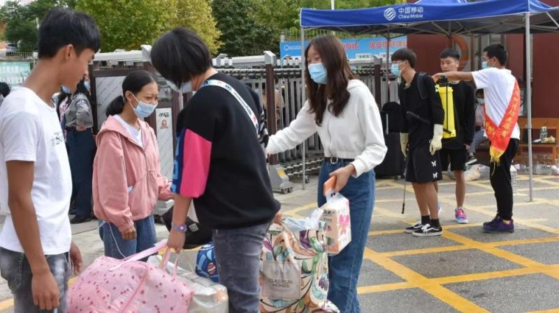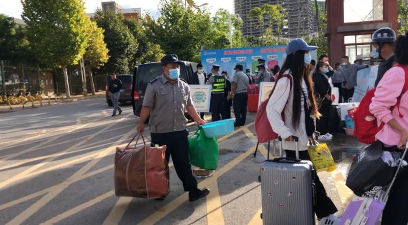 紧接着新生们的行李经过严格消毒由志愿者帮忙分批次送到宿舍楼下。