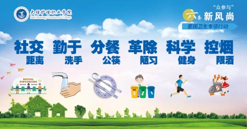 为深入贯彻落实习近平总书记关于新时代爱国卫生运动重要指示精神,以及立足疫情防控常态化要求,全省开展的以“清垃圾、扫厕所、勤洗手、净餐馆、常消毒、管集市、众参与”为主题的爱国卫生“7个专项行动”,全面提升学院公共卫生水平和校园环境质量,引导全体师生养成文明健康新风尚,在此,我们向大家发出倡议: