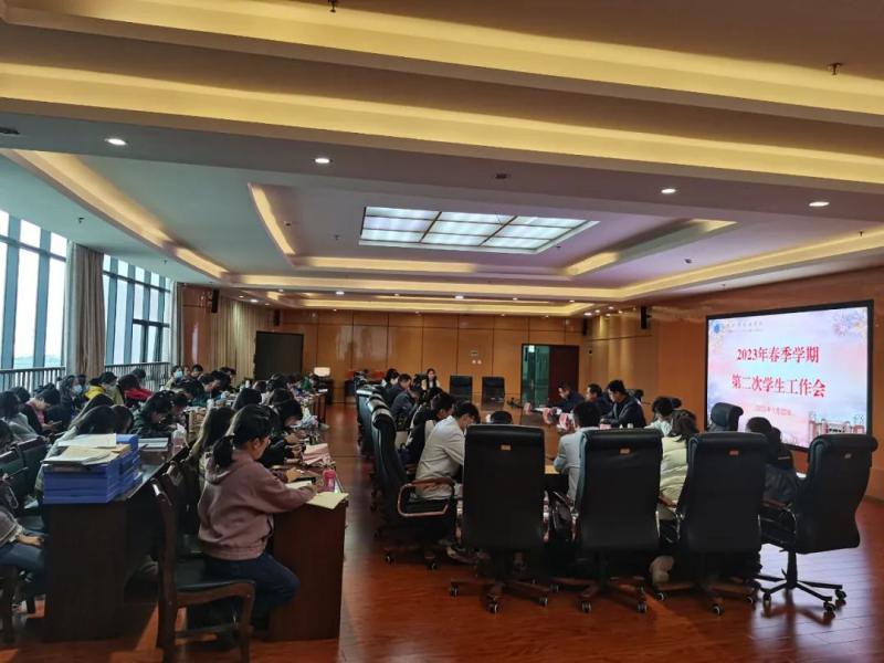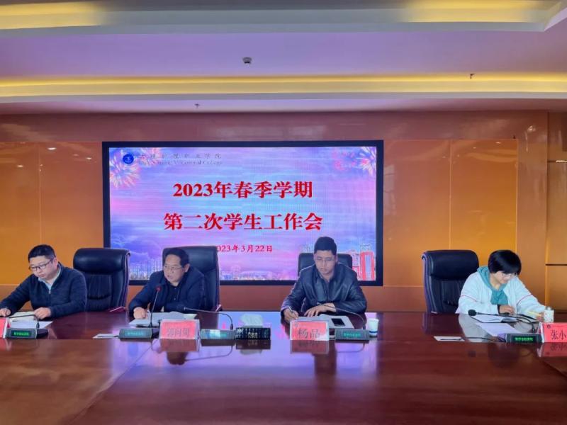 3月22日下午,bat365中文官方网站召开2023年春季学期第二次学生工作会议,进一步全面总结本学期开学以来学生工作的经验与成效,科学分析当前学生工作面临的新形势新问题,安排部署2023年春季学期学生工作。校党委委员、副院长郭向周参加会议并作了工作要求,学生科相关人员,各系党支部书记、主任、副主任、学生管理科长,在校班级辅导员、班主任参加会议。校党委委员、学生科负责人杨品主持会议。