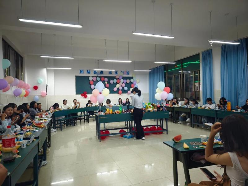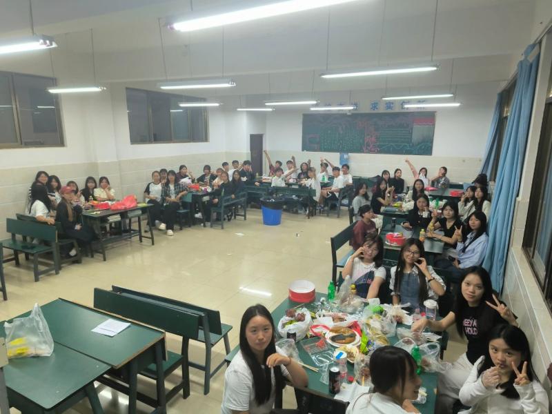 随着夜幕降临,一轮明月缓缓升起,班级全体师生围坐一圈,共享着美味的月饼与零食,畅谈着理想与未来,享受着这难得的休闲时光。大家纷纷举起手机,记录下这美好的瞬间,也将这份温情与祝福传递给远方的家人和朋友。