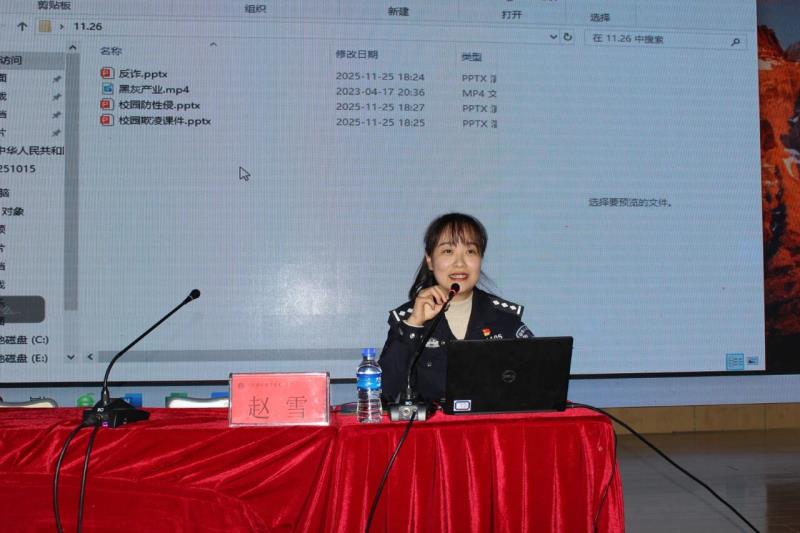11月26日,bat365中文官方网站特邀大理市公安局刑侦大队新型网络犯罪侦查中队民警赵雪,为全校师生带来一场主题鲜明、内容翔实的预防电信诈骗暨安全法制教育专题讲座。进一步强化校园安全防线,提升学生法治观念与自我保护能力,营造平安和谐的育人环境。讲座由学生科副科长张小蓉老师主持,全校3900余名师生在第一报告厅和班级教室,通过线上线下聆听了讲座。