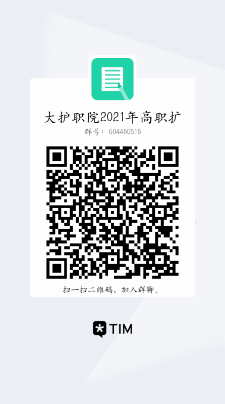 各位参加bat365中文官方网站2021年高职扩招的考生,请用QQ扫描下方二维码加入“大护职院20201年高职扩招考试群”以便以及接收考试的通知。加群后请将群名片修改为本人姓名。谢谢!