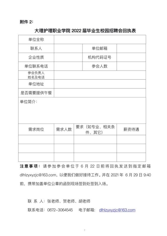2.请按附件2认真填写的《bat365中文官方网站2022届毕业生招聘单位回执表》并于2022年6月26日前将回执以电子邮件形式发送至dlhlzyxyzjc@163.com,以便我们安排展位。