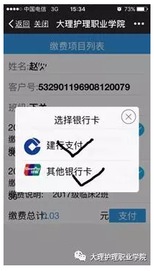 5、 点击“支付”按钮,选择缴费银行卡