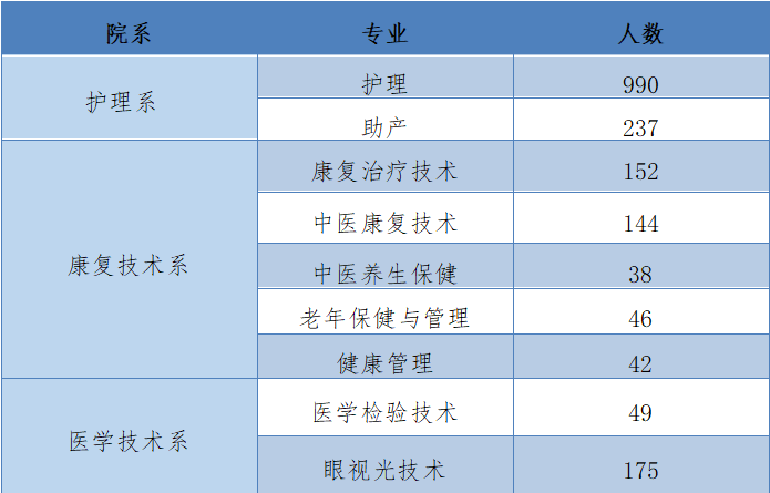 bat3652024届有护理、助产、医学检验技术、眼视光技术、健康管理、康复治疗技术、中医康复技术、中医养生保健及老年保健与管理9个专业高职专科毕业生共1834人,具体专业分布如下表: