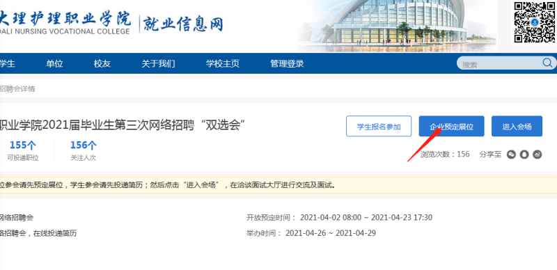用人单位报名方式:登录护理职业学院就业信息网(网站网址:http://dlhlzyxy.jysd.com/),或扫描下方二维码登录。登陆后的后续操作详见附件1。