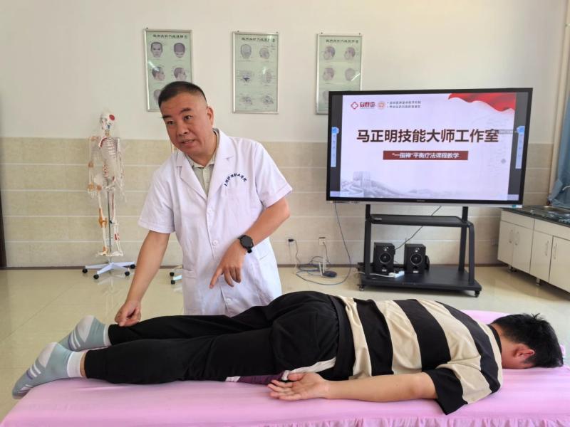 在中医康复技术实践课上,马正明院长以“一指禅”平衡疗法为主题,从该疗法的理论基础、手法要点到临床实际应用进行了系统讲解,现场示范展示了手指发力技巧与身体姿势配合的关键细节。在实践互动环节,学生们踊跃上台体验操作,马院长逐一指导纠正手法,帮助学生在实践中深化理解。“中医技术的精髓在于‘手到心至’,希望同学们通过反复练习体悟其中的平衡之道。”马院长强调。