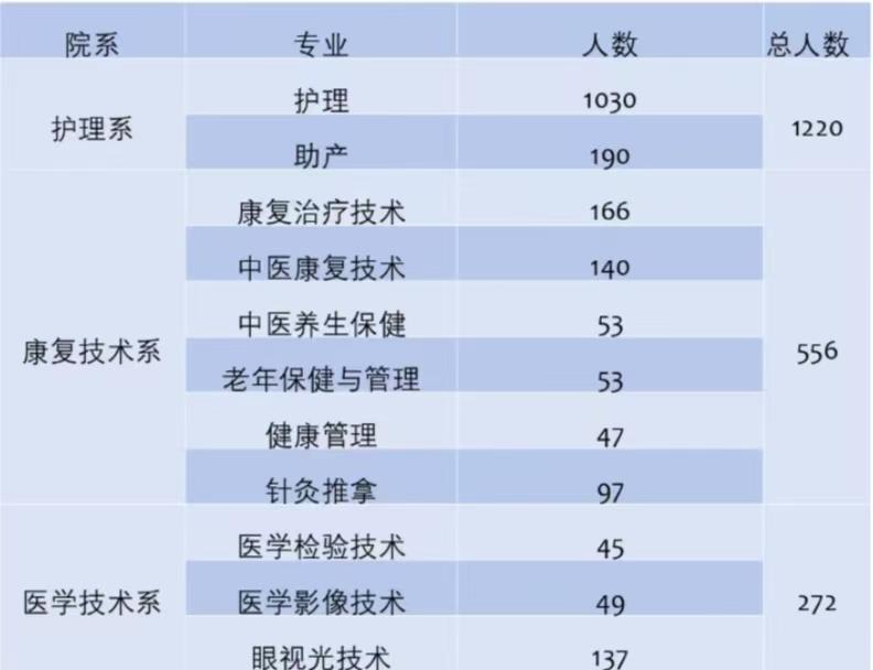 学校2026届有护理、助产、医学检验技术、眼视光技术、健康管理、康复治疗技术、中医康复技术、中医养生保健及老年保健与管理、针灸推拿、视觉训练与康复、医学影像技术等12个专业高职专科毕业生共2048人,具体专业分布如下表: